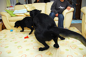 すげぇ〜かわいい。今日から二日間よろしくね や〜、4ヶ月の子犬を触るのちょー久しぶり レオも相当興奮して、大暴れ。一息ついてレオパパもカメラ持って参上。 おもちゃ箱から好きなおもちゃ選んで遊ぶ ひっぱりっこ レオの行動も全く同レベル ティア・・・おまえ、かわいいなぁ〜 なかよし 興奮が絶頂に達してきたところで さて、 ここから ティアの猫パンチならぬ、犬パンチ特集 先ずは、いきなり大きい犬パンチ、岩石落とし フリかぶってぇ〜〜 パーンチ レオもびんたで応戦 いくぞーーっ だーっ 押さえ込み・・・ゎぁ〜レオ押され気味 パンチパンチパンチ だぁーーーっ カミカミ反則 あらまっ いやぁ〜ん 見ないで ティアもだんだん図々しくなってきた レオの上に乗りそうになっては 追いかけられ やばくなると、熱いまなざし光線 疲れないの? レオはかなり息上がってるよ レオもこんな時期があったんだよなぁ〜 レオはパピーの頃手が掛からなかったから 次もパピーから世話したい・・・けど レオにとって 楽しいのが強いか ストレスの方が強いのか ねぇ〜、ティア おしっこ4回もしてくれて、とうとうおしめ。 さて、ご飯だよ さすがに、電池切れかい? レオもさすがに疲れて、もういやいやモード 意外にも、外のボールが怖かったりして・・・ 疲れたネェ〜 よっぽど疲れたのはレオの方 お休み レオ・・・・ だっ、だいじょうぶ??? ティア、また遊ぼうな それまで、レオも体力つけとくから お休み ちょっとお風呂で遊んでみた ← →
